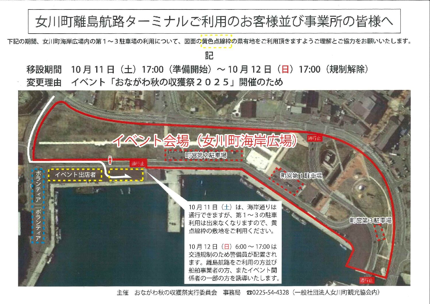 10月12日(日)サンマ収獲祭2025が海岸広場にて開催されます。それに伴い交通規制、駐車場利用が出来なくなりますので、お知らせいたします。大変混み合うと予想されます。時間に余裕を持ってお越しください。サンマ収獲祭にお越しのお客様は、イベントトイレをお使いください。毎年トイレトラブルがありますので、くれぐれもイベントトイレを利用願います。2025_autumn_poster